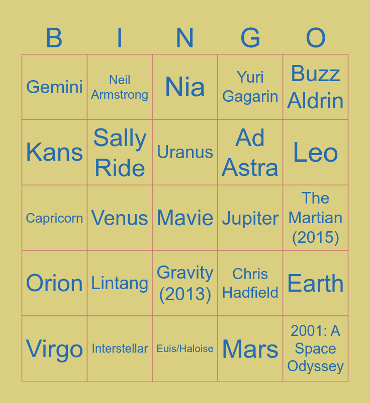 This bingo card has a free space and 24 words: Lintang, Interstellar, Uranus, Virgo, Buzz Aldrin, Gemini, Kans, Neil Armstrong, Jupiter, Gravity (2013), Ad Astra, Capricorn, Chris Hadfield, Earth, Sally Ride, Mars, The Martian (2015), Nia, Leo, Venus, 2001: A Space Odyssey, Orion, Yuri Gagarin and Euis/Haloise.