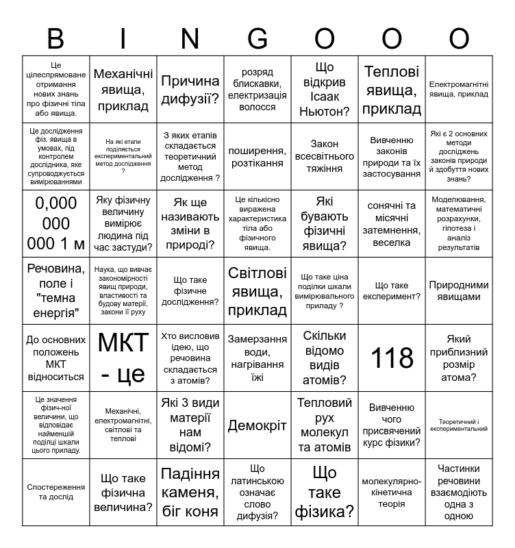 This bingo card has a free space and 49 words: Вивченню чого присвячений курс фізики?, Вивченню законів природи та їх застосування, Що таке фізика?, Наука, що вивчає закономірності явищ природи, властивості та будову матерії, закони її руху, Як ще називають зміни в природі?, Природними явищами, Механічні явища, приклад, Падіння каменя, біг коня, Теплові явища, приклад, Замерзання води, нагрівання їжі, Електромагнітні явища, приклад, розряд блискавки, електризація волосся, сонячні та місячні затемнення, веселка, Які бувають фізичні явища?, Механічні, електромагнітні, світлові та теплові, Що таке експеримент?, Це дослідження фіз. явища в умовах, під контролем дослідника, яке супроводжується вимірюваннями, Які є 2 основних методи досліджень законів природи й здобуття нових знань?, Теоретичний і експериментальний, Що відкрив Ісаак Ньютон?, Закон всесвітнього тяжіння, Що таке фізичне дослідження?, Це цілеспрямоване отримання нових знань про фізичні тіла або явища., На які етапи поділяється експериментальний метод дослідження ?, Спостереження та дослід, З яких етапів складається теоретичний метод дослідження ?, Моделювання, математичні розрахунки, гіпотеза і аналіз результатів, Що таке фізична величина?, Це кількісно виражена характеристика тіла або фізичного явища., Яку фізичну величину вимірює людина під час застуди?, Температуру, Що таке ціна поділки шкали вимірювального приладу ?, Це значення фізич-ної величини, що відповідає найменшій поділці шкали цього приладу., Які 3 види матерії нам відомі?, Речовина, поле і "темна енергія", Скільки відомо видів атомів?, 118, Який приблизний розмір атома?, 0,000 000 000 1 м, Хто висловив ідею, що речовина складається з атомів?, Демокріт, До основних положень МКТ відноситься, Частинки речовини взаємодіють одна з одною, Що латинською означає слово дифузія?, поширення, розтікання, Причина дифузії?, Тепловий рух молекул та атомів, МКТ - це and молекулярно-кінетична теорія.