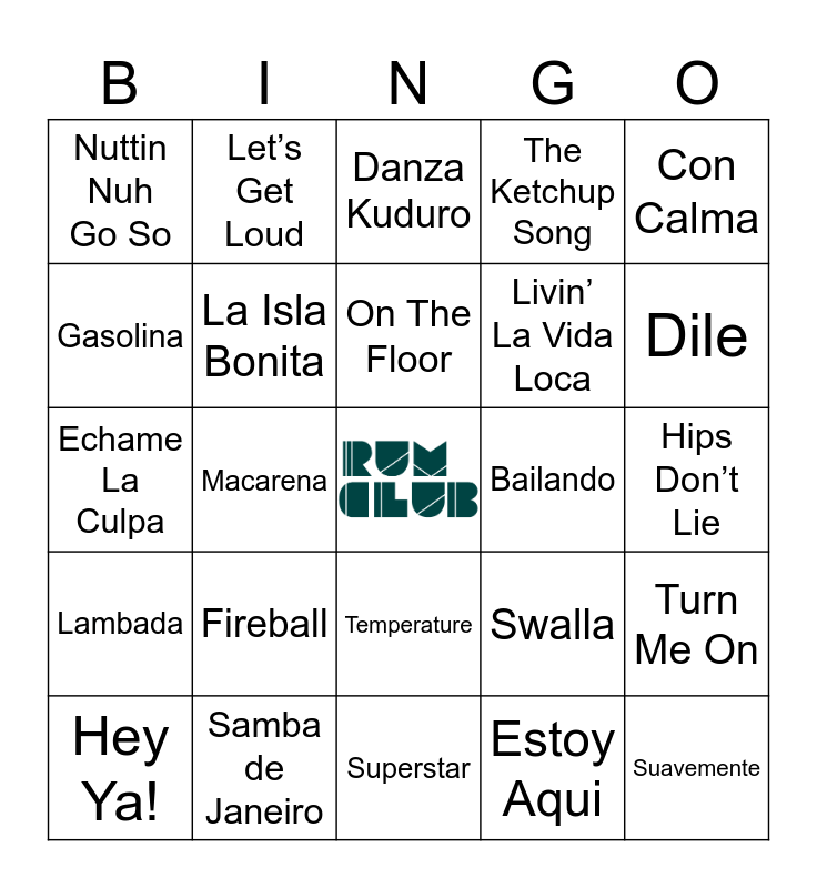 This bingo card has a free space and 38 words: Blinding Lights, Despacito, I Know You Want Me, La Isla Bonita, Turn Me On, Fireball, On The Floor, Waka Waka, Con Calma, Livin’ La Vida Loca, Macarena, The Ketchup Song, Suavemente, Hips Don’t Lie, Gasolina, Lambada, Pepas, Danza Kuduro, Schudden, Bailando, Nuttin Nuh Go So, Samba de Janeiro, Dile, Hey Ya!, Say It Right, Superstar, It Wasn’t Me, Hold You, Murder She Wrote, Mambo No. 5, Conga!, Temperature, Estoy Aqui, Let’s Get Loud, Wannabe, Swalla, Echame La Culpa and Maria.