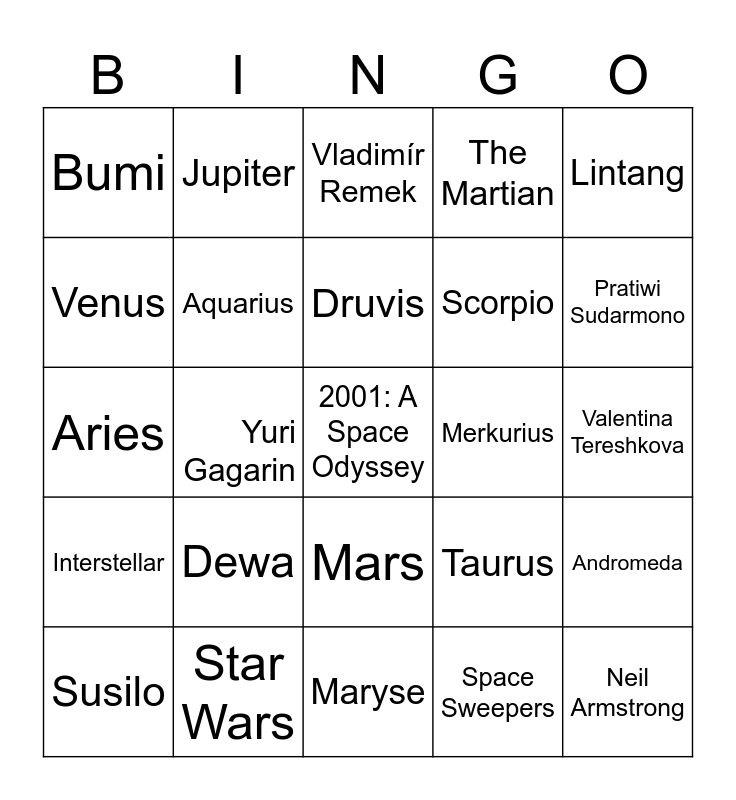 This bingo card has 25 words: Dewa, Maryse, Druvis, Susilo, Lintang, Bumi, Venus, Jupiter, Merkurius, Mars, Scorpio, Aries, Taurus, Andromeda, Aquarius, Neil Armstrong, Valentina Tereshkova, Vladimír Remek, Pratiwi Sudarmono, Yuri Gagarin, 2001: A Space Odyssey, Star Wars, Interstellar, The Martian and Space Sweepers.