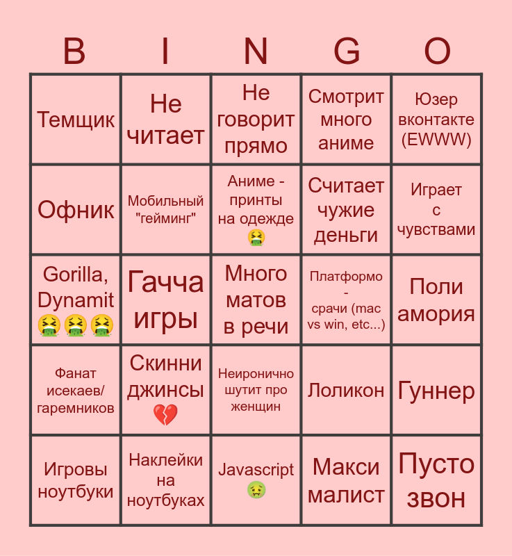 This bingo card has 25 words: Скинни джинсы 💔, Javascript 🤢, Аниме - принты на одежде 🤮, Игровы ноутбуки, Юзер вконтакте (EWWW), Темщик, Офник, Не читает, Платформо - срачи (mac vs win, etc...), Неиронично шутит про женщин, Считает чужие деньги, Gorilla, Dynamit 🤮🤮🤮, Лоликон, Гуннер, Мобильный "гейминг", Пусто звон, Поли амория, Не говорит прямо, Играет с чувствами, Гачча игры, Много матов в речи, Наклейки на ноутбуках, Фанат исекаев/ гаремников, Смотрит много аниме and Макси малист.