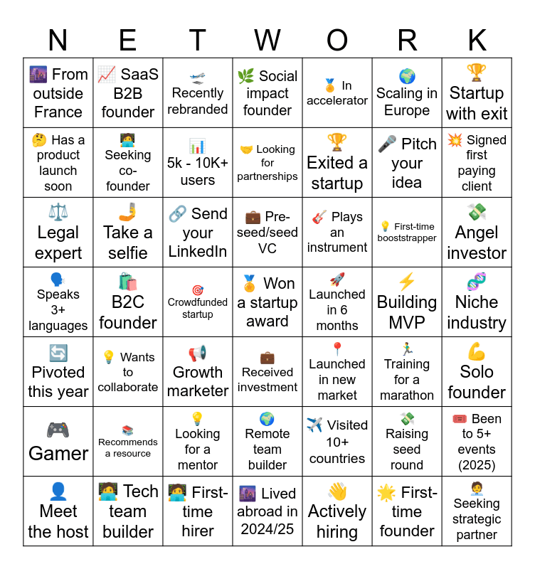 This bingo card has 49 words: 💸 Raising seed round, 🎤 Pitch your idea, 👋 Actively hiring, 🛍️ B2C founder, 🔗 Send your LinkedIn, 🧬 Niche industry, 📈 SaaS B2B founder, 🧑💻 First-time hirer, 🌍 Scaling in Europe, 💼Received investment, 🏆 Startup with exit, 🌿 Social impact founder, 💡 First-time booststrapper, 🎸 Plays an instrument, 📚 Recommends a resource, ⚡ Building MVP, 🤔 Has a product launch soon, 💥 Signed first paying client, 🎟️ Been to 5+ events (2025), 🏅 In accelerator, 🏆 Exited a startup, 🎯 Crowdfunded startup, 🌆 From outside France, 🧑💻 Seeking co-founder, 👤 Meet the host, 📊 5k - 10K+ users, 💸 Angel investor, 🧑💻 Tech team builder, 💼 Pre-seed/seed VC, 🤳 Take a selfie, 🧑💼 Seeking strategic partner, 🚀 Launched in 6 months, 🎮 Gamer, 💡 Looking for a mentor, 🗣️ Speaks 3+ languages, 📍 Launched in new market, 🏃♂️ Training for a marathon, 💪 Solo founder, ⚖️ Legal expert, 📢 Growth marketer, 🌍 Remote team builder, 🔄 Pivoted this year, 🏅 Won a startup award, 🌆 Lived abroad in 2024/25, 🤝 Looking for partnerships, 🛫 Recently rebranded, ✈️ Visited 10+ countries, 💡 Wants to collaborate and 🌟 First-time founder.