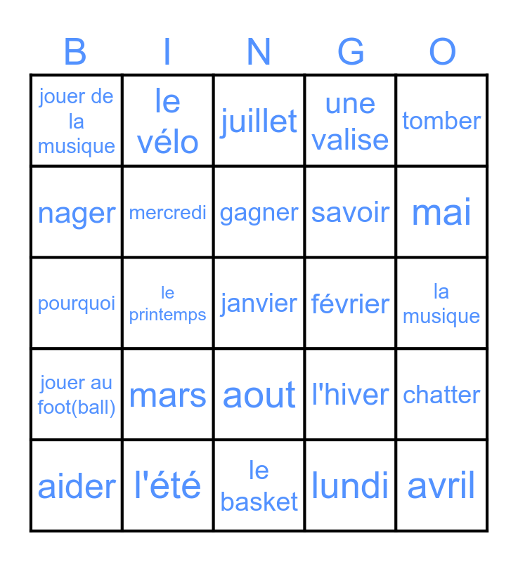 This bingo card has 50 words: chanter, janvier, jouer aux cartes, le basket, mars, faire du sport, le vélo, les vacances, nager, peut-être, mercredi, une valise, chatter, l'hiver, mardi, un match, gagner, février, une promenade, tomber, le printemps, lundi, jouer de la musique, savoir, surfer sur l'internet, avril, mai, juin, juillet, aout, septembre, octobre, novembre, décembre, l'été, l'automne, un an, une chanson, un cinéma, la musique, une radio, un sport, un télé(vision), je n'aime pas, aider, pourquoi, un CD, jouer à la balle, jouer au foot(ball) and se promener.