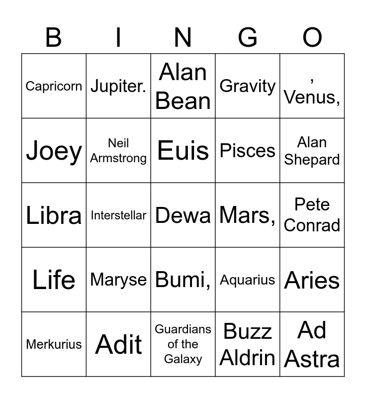 This bingo card has a free space and 24 words: Maryse, Adit, Euis, Merkurius, , Venus,, Capricorn, Joey, Jupiter., Mars,, Bumi,, Pisces, Libra, Aquarius, Aries, Neil Armstrong, Buzz Aldrin, Pete Conrad, Alan Bean, Alan Shepard, Interstellar, Ad Astra, Life, Gravity and Guardians of the Galaxy.