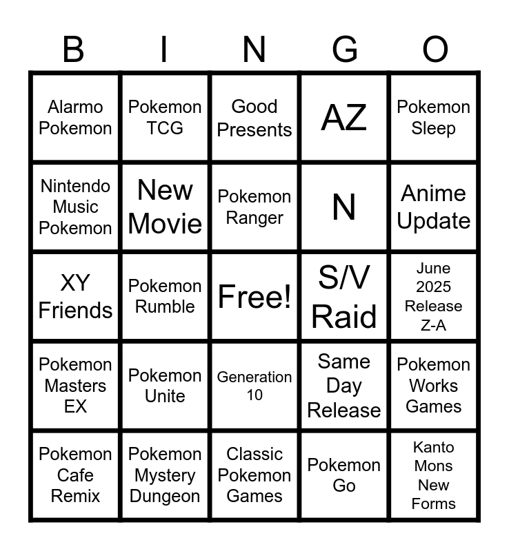 This bingo card has a free space and 24 words: Pokemon Unite, Pokemon Mystery Dungeon, Pokemon Ranger, Pokemon Cafe Remix, Pokemon Sleep, Alarmo Pokemon, Nintendo Music Pokemon, Pokemon TCG, S/V Raid, Generation 10, N, XY Friends, Same Day Release, Pokemon Works Games, New Movie, Pokemon Go, June 2025 Release Z-A, Good Presents, Anime Update, Pokemon Rumble, Kanto Mons New Forms, Pokemon Masters EX, AZ and Classic Pokemon Games.