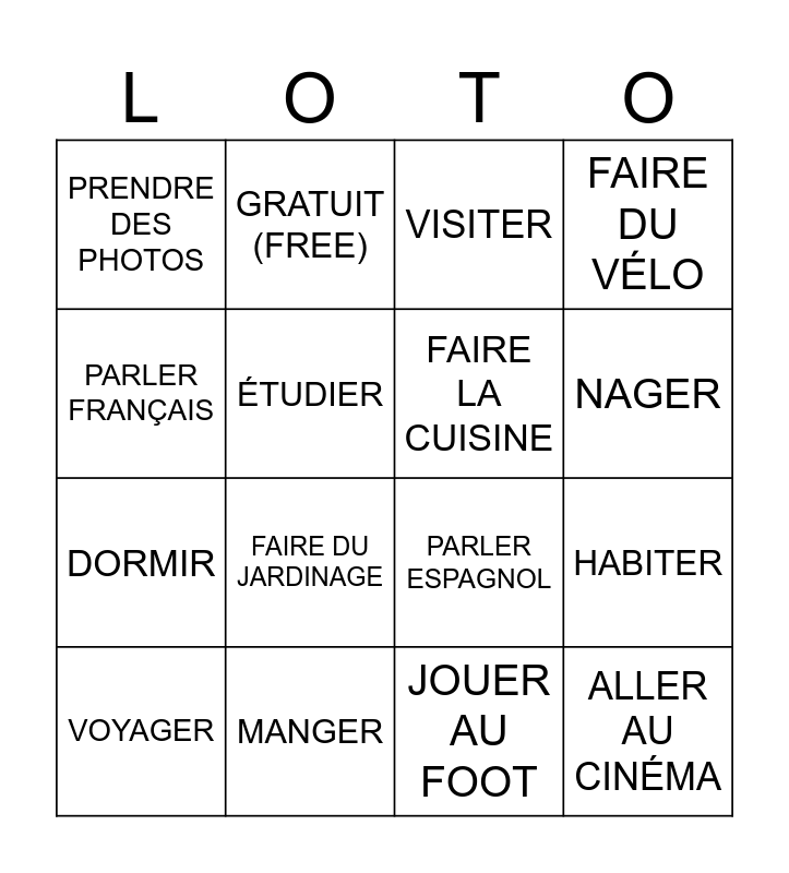 This bingo card has 32 words: REGARDER, DESSINER, HABITER, TRAVAILLER, ALLER AU CINÉMA, FAIRE LA CUISINE, PARLER FRANÇAIS, ÉCOUTER LA MUSIQUE, GRATUIT (FREE), DANSER, NAGER, VISITER, ALLER AU CONCERT, FAIRE DU SHOPPING, MANGER, TÉLÉPHONER, AIMER, PARLER ESPAGNOL, CHANTER, JOUER AU BASKET, DÎNER, LIRE, JOUER AU FOOT, PARLER ANGLAIS, VOYAGER, FAIRE DU VÉLO, DORMIR, ÉTUDIER, PRENDRE DES PHOTOS, JOUER AUX JEUX VIDÉO, DONNER and FAIRE DU JARDINAGE.