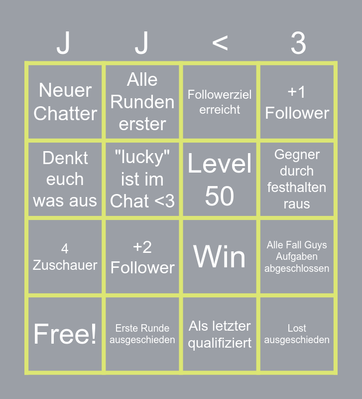 This bingo card has 16 words: Erste Runde ausgeschieden, Alle Fall Guys Aufgaben abgeschlossen, Followerziel erreicht, Neuer Chatter, 4 Zuschauer, Alle Runden erster, Win, Als letzter qualifiziert, Denkt euch was aus, "lucky" ist im Chat <3, Free!, +1 Follower, +2 Follower, Gegner durch festhalten raus, Level 50 and Lost ausgeschieden.