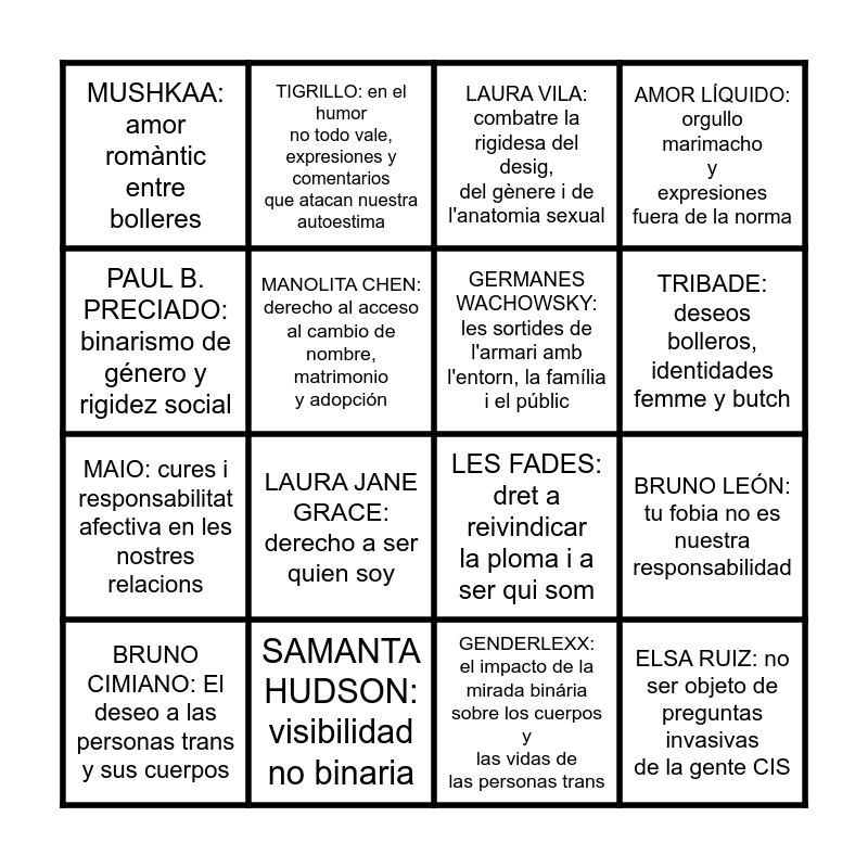 This bingo card has 18 words: PAUL B. PRECIADO: binarismo de género y rigidez social, SAMANTA HUDSON: visibilidad no binaria, LAURA VILA: combatre la rigidesa del desig, del gènere i de l'anatomia sexual, AMOR LÍQUIDO: orgullo marimacho y expresiones fuera de la norma, MAIO: cures i responsabilitat afectiva en les nostres relacions, TIGRILLO: en el humor no todo vale, expresiones y comentarios que atacan nuestra autoestima, LES FADES: dret a reivindicar la ploma i a ser qui som, TRIBADE: deseos bolleros, identidades femme y butch, MUSHKAA: amor romàntic entre bolleres, LAURA JANE GRACE: derecho a ser quien soy, GENDERLEXX: el impacto de la mirada binária sobre los cuerpos y las vidas de las personas trans, BRUNO LEÓN: tu fobia no es nuestra responsabilidad, BRUNO CIMIANO: El deseo a las personas trans y sus cuerpos, MANOLITA CHEN: derecho al acceso al cambio de nombre, matrimonio y adopción, GERMANES WACHOWSKY: les sortides de l'armari amb l'entorn, la família i el públic, ELSA RUIZ: no ser objeto de preguntas invasivas de la gente CIS, VILLANO ANTILLANO: presión estética por validar su identidad en una sociedad binaria and SYLVIA RIVERA: inclusió de les demandes trans a l'agenda política de les dissidències.