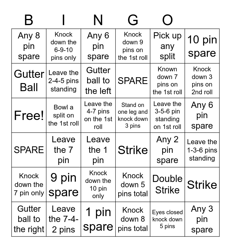 This bingo card has 36 words: Knock down 5 pins total, Knock down the 10 pin only, Knock down 8 pins total, Gutter Ball, SPARE, Stand on one leg and knock down 3 pins, Leave the 2-4-5 pins standing, 1 pin spare, Pick up any split, Double Strike, Knock down 3 pins on 2nd roll, Knock down 9 pins on the 1st roll, Strike, Bowl a split on the 1st roll, SPARE, Any 8 pin spare, Knock down the 7 pin only, Leave the 3-5-6 pin standing on 1st roll, Free!, Any 6 pin spare, Leave the 4-7 pins on the 1st roll, Leave the 7 pin, Strike, Leave the 1 pin, Any 2 pin spare, Knock down the 6-9-10 pins only, Known down 7 pins on the 1st roll, Leave the 7-4-2 pins, Gutter ball to the left, 10 pin spare, Any 3 pin spare, Gutter ball to the right, Leave the 1-3-6 pins standing, Any 6 pin spare, 9 pin spare and Eyes closed knock down 5 pins.
