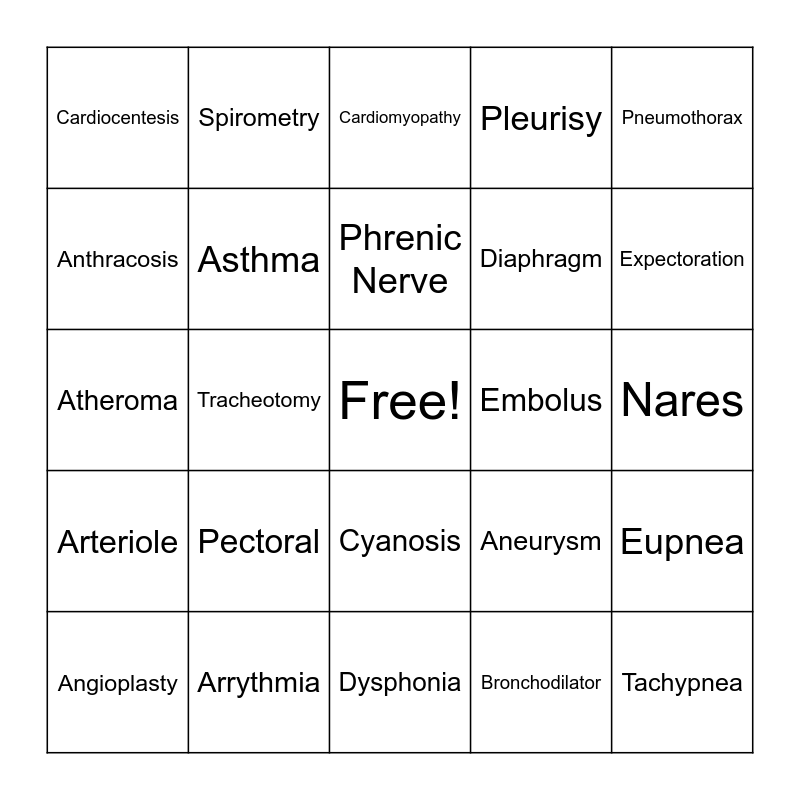 This bingo card has a free space and 24 words: Pectoral, Arrythmia, Phrenic Nerve, Angioplasty, Pneumothorax, Cardiocentesis, Anthracosis, Spirometry, Embolus, Cyanosis, Diaphragm, Atheroma, Aneurysm, Eupnea, Asthma, Bronchodilator, Nares, Cardiomyopathy, Expectoration, Tracheotomy, Tachypnea, Arteriole, Pleurisy and Dysphonia.