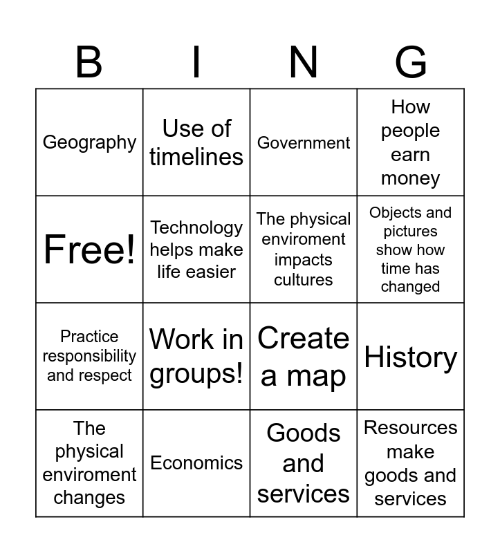 This bingo card has 16 words: Economics, History, Government, Geography, Practice responsibility and respect, Use of timelines, Create a map, Goods and services, Free!, Technology helps make life easier, The physical enviroment changes, How people earn money, Work in groups!, Objects and pictures show how time has changed, The physical enviroment impacts cultures and Resources make goods and services.