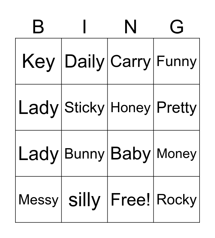This bingo card has 17 words: Free!, Messy, Carry, Key, Bunny, Funny, Money, Honey, Pretty, Sticky, silly, Baby, Lady, Daily, Lady, Sunny and Rocky.
