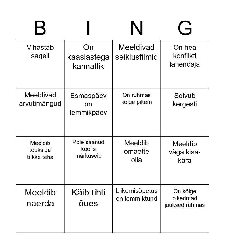 This bingo card has 16 words: Meeldib naerda, Käib tihti õues, Meeldivad seiklusfilmid, On hea konflikti lahendaja, Meeldivad arvutimängud, On kaaslastega kannatlik, Meeldib omaette olla, Meeldib väga kisa-kära, Vihastab sageli, Esmaspäev on lemmikpäev, Liikumisõpetus on lemmiktund, Solvub kergesti, Meeldib tõuksiga trikke teha, Pole saanud koolis märkuseid, On rühmas kõige pikem and On kõige pikedmad juuksed rühmas.