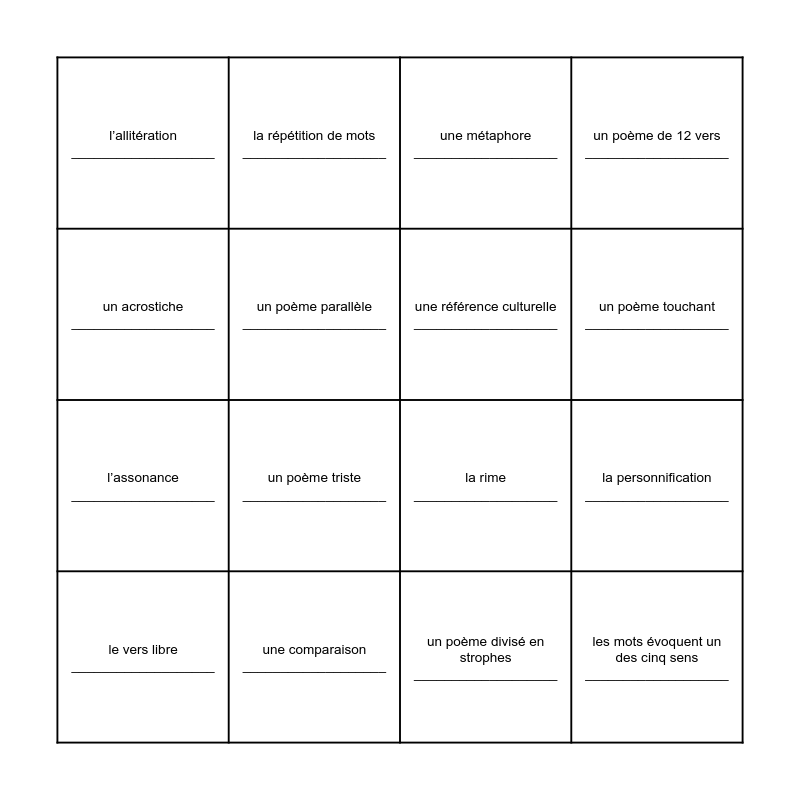 This bingo card has 16 words: une comparaison ___________________, la personnification ___________________, une métaphore ___________________, l’allitération ___________________, l’assonance ___________________, la répétition de mots ___________________, la rime ___________________, un poème divisé en strophes ___________________, un acrostiche ___________________, un poème parallèle ___________________, le vers libre ___________________, un poème de 12 vers ___________________, un poème triste ___________________, un poème touchant ___________________, une référence culturelle ___________________ and les mots évoquent un des cinq sens ___________________.