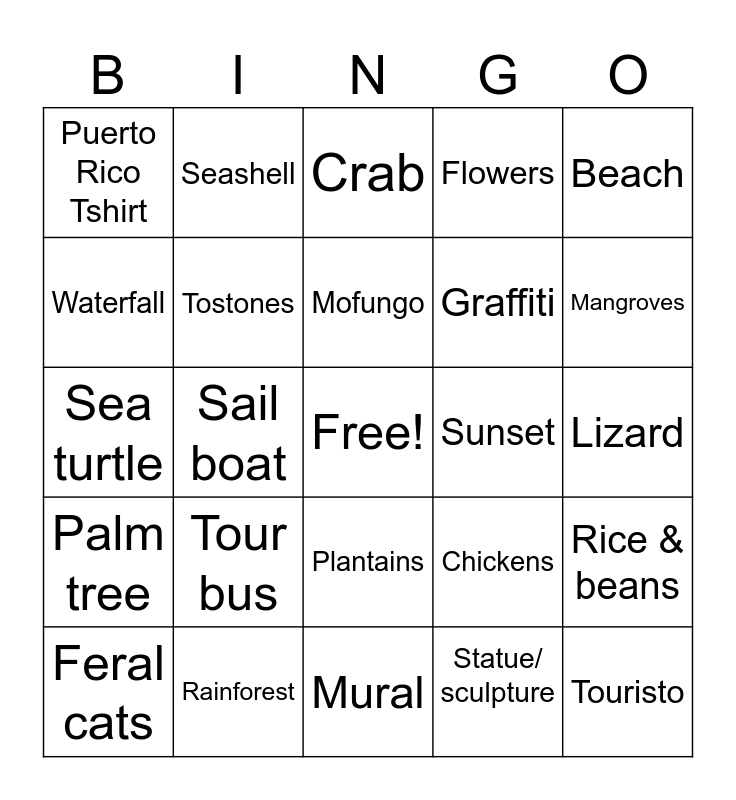 This bingo card has a free space and 24 words: Feral cats, Tour bus, Mofungo, Statue/ sculpture, Beach, Puerto Rico Tshirt, Seashell, Crab, Sunset, Lizard, Sea turtle, Tostones, Chickens, Rice & beans, Waterfall, Rainforest, Mural, Flowers, Mangroves, Palm tree, Sail boat, Plantains, Graffiti and Touristo.