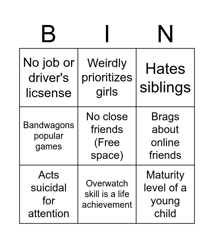 This bingo card has a free space and 24 words: Doesn't help family, 8+ hours on phone every day, Overwatch skill is a life achievement, Has a discord girlfriend, Maturity level of a young child, No job or driver's licsense, Brags about online friends, Weirdly prioritizes girls, Plans never work out due to procrastination, Wants to major in art or music, YT channel consists of stolen content, Had Kik, Social media has cringe old selfies, Noticeably fake laughs, Acts suicidal for attention, Plans to meet up with an underage girl, Mocks friend's career plans, Hates siblings, Uses friends for social padding, Has hentai saved on multiple devices, Dependent on parents for everything, Hates going outside, Bandwagons popular games and Makes excuses instead of being honest.