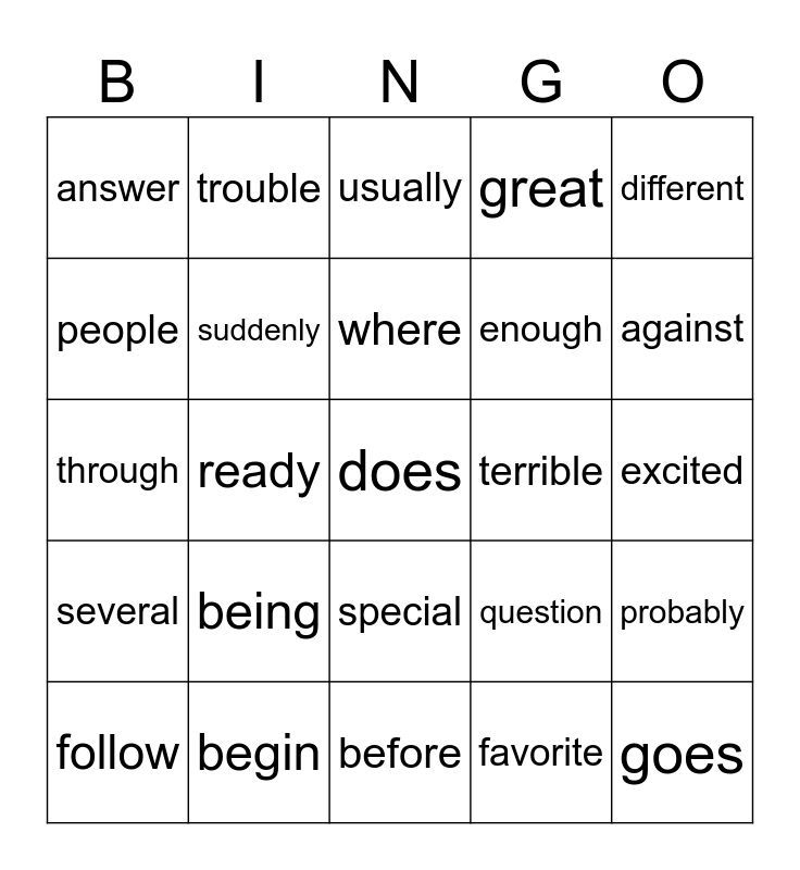 This bingo card has a free space and 24 words: being, begin, where, follow, different, answer, people, trouble, terrible, special, enough, through, question, probably, suddenly, favorite, excited, usually, against, ready, goes, several, great and before.