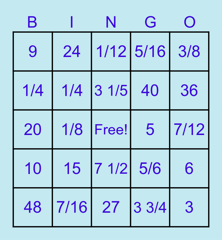 This bingo card has a free space and 24 words: 15, 7/16, 3 1/5, 48, 3/8, 9, 1/4, 24, 5, 7 1/2, 40, 20, 5/6, 6, 1/4, 3 3/4, 7/12, 1/12, 36, 1/8, 3, 10, 5/16 and 27.