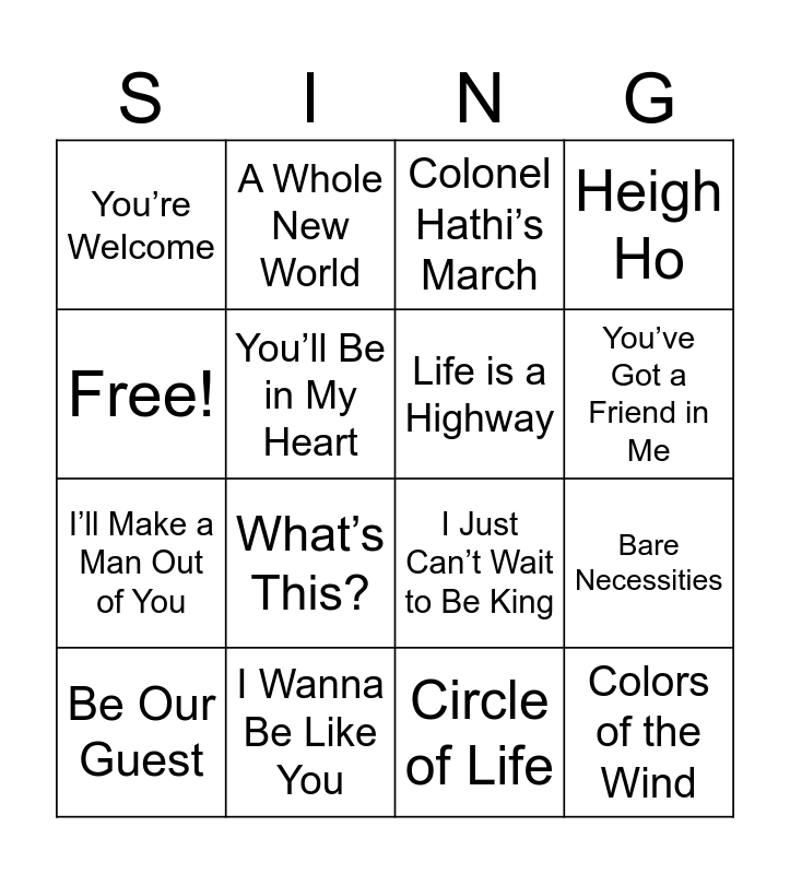 This bingo card has 16 words: I Wanna Be Like You, Bare Necessities, Colonel Hathi’s March, You’re Welcome, I’ll Make a Man Out of You, A Whole New World, I Just Can’t Wait to Be King, Circle of Life, Free!, You’ll Be in My Heart, Be Our Guest, Heigh Ho, What’s This?, You’ve Got a Friend in Me, Life is a Highway and Colors of the Wind.