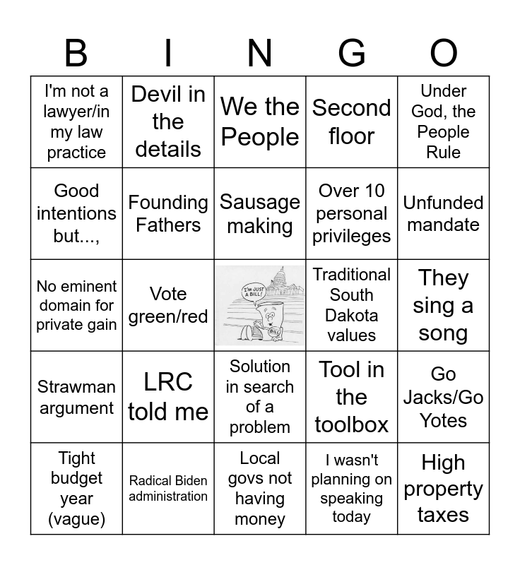 This bingo card has a free space and 34 words: Local control, I wasn't planning on speaking today, I'll be brief, Not ready for primetime, Strawman argument, Founding Fathers, Under God, the People Rule, Tight budget year (vague), Devil in the details, Kicking the can down the road, Sausage making, We the People, Protecting children, This bill is about freedom, Traditional South Dakota values, Unfunded mandate, Radical Biden administration, No eminent domain for private gain, LRC told me, Tool in the toolbox, Solution in search of a problem, This is a simple cleanup bill, I'm not a lawyer/in my law practice, They sing a song, Local govs not having money, High property taxes, Second floor, Second amendment reference, Over 10 personal privileges, Good intentions but...,, I respectfully defer my time to the bill's prime sponsor, Vote green/red, Go Jacks/Go Yotes and Unintended consequences.
