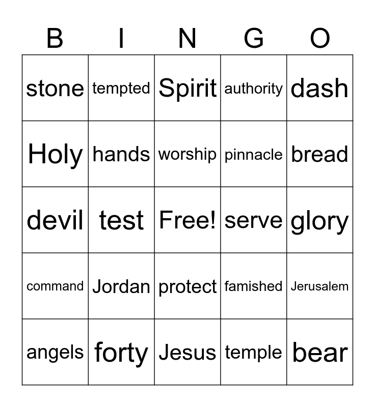 This bingo card has a free space and 24 words: Jordan, forty, worship, angels, dash, stone, Holy, tempted, serve, protect, pinnacle, devil, famished, Jerusalem, hands, temple, glory, Spirit, bread, test, bear, command, authority and Jesus.