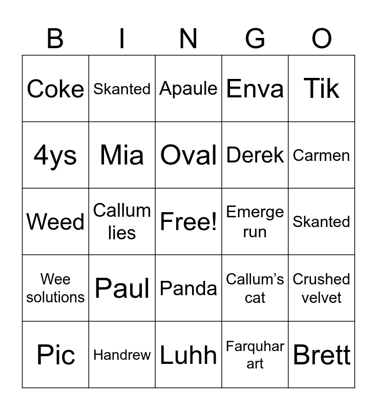 This bingo card has a free space and 24 words: Paul, Handrew, Oval, Pic, Tik, Coke, 4ys, Skanted, Emerge run, Panda, Derek, Weed, Callum’s cat, Crushed velvet, Mia, Farquhar art, Skanted, Apaule, Carmen, Callum lies, Brett, Wee solutions, Enva and Luhh.