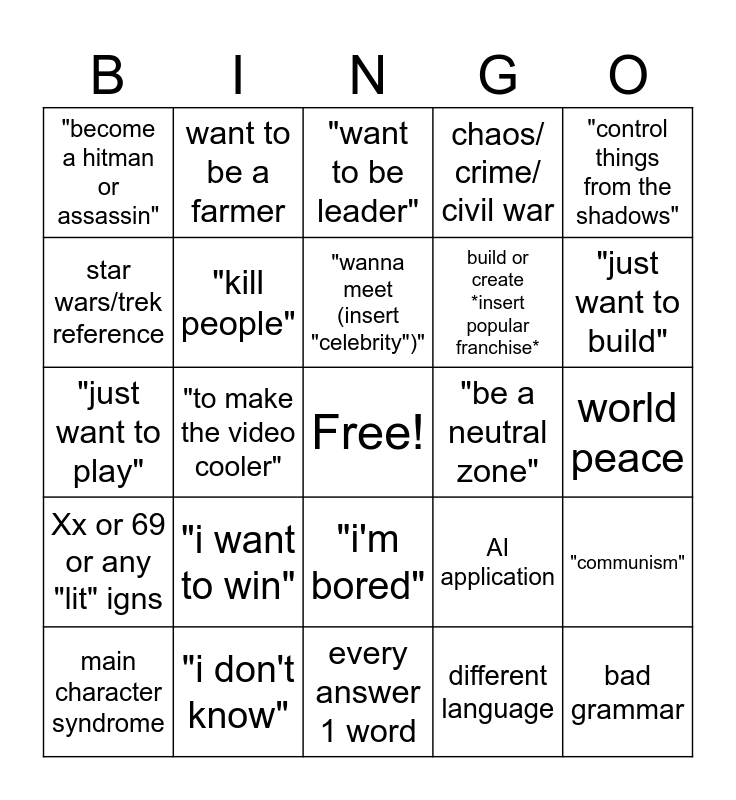 This bingo card has a free space and 24 words: "i want to win", "i don't know", "wanna meet (insert "celebrity")", main character syndrome, "control things from the shadows", "become a hitman or assassin", star wars/trek reference, want to be a farmer, "be a neutral zone", "i'm bored", build or create *insert popular franchise*, "just want to play", AI application, "communism", "kill people", different language, world peace, "want to be leader", "just want to build", "to make the video cooler", bad grammar, Xx or 69 or any "lit" igns, chaos/ crime/ civil war and every answer 1 word.