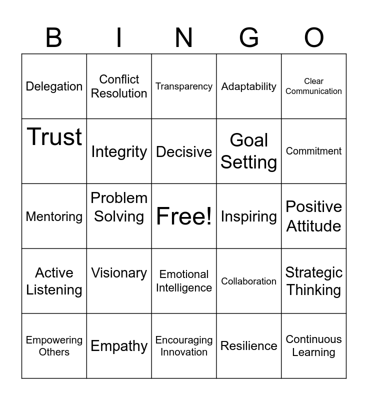 This bingo card has a free space and 24 words: Visionary, Empathy, Decisive, Empowering Others, Clear Communication, Delegation, Trust, Conflict Resolution, Inspiring, Emotional Intelligence, Goal Setting, Mentoring, Collaboration, Strategic Thinking, Integrity, Resilience, Positive Attitude, Transparency, Commitment, Problem Solving, Continuous Learning, Active Listening, Adaptability and Encouraging Innovation.