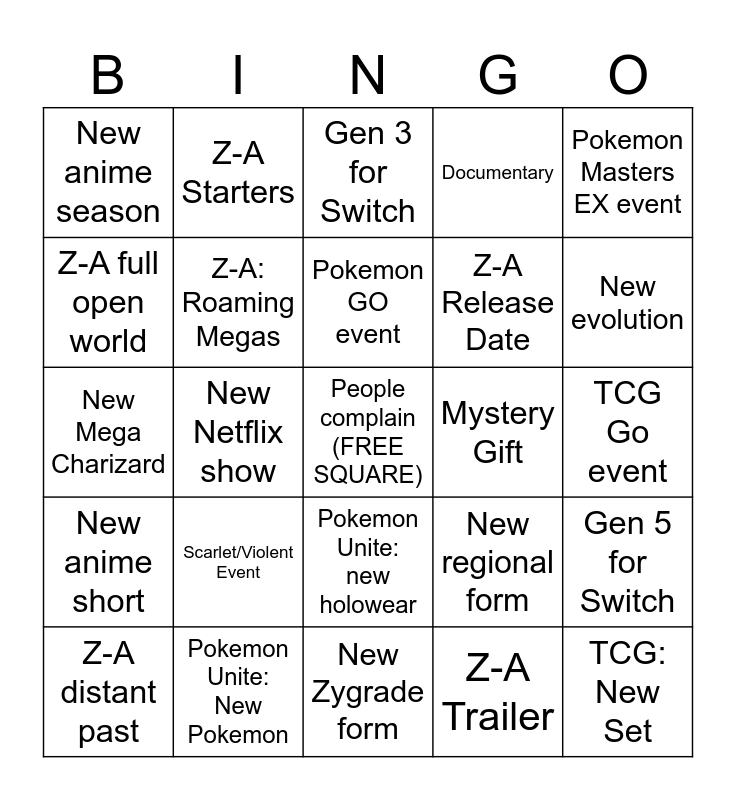 This bingo card has a free space and 40 words: New Mega (Not Charizard), New Mega Charizard, Mega Legendary, Z-A: Roaming Megas, Pokemon Unite: New Pokemon, Pokemon Unite: new holowear, Pokemon GO event, Pokemon Cafe Remix event, Pokemon Masters EX event, New anime short, New Netflix show, Documentary, TCG: New Set, TCG Go event, Mystery Gift, Scarlet/Violent Event, Scarlet/Violent shiny legendary, New anime season, New anime theatrical movie, Gen 3 for Switch, Gen 5 for Switch, Z-A Trailer, Z-A Release Date, Z-A full open world, Z-A pseudo open world (big areas), Z-A tie-in anime series, Pokemon Concierge, Gen 6 faithful remake (BDSP-like), Scarlet Violet enhanced for Switch 2, Switch 2 specs, Worlds 2025 trailer, Z-A distant past, Z-A modern / recent past, New regional form, New evolution, New Zygrade form, New "A" pokemon, "Z"-shape mega, Z-A Starters and Pokemon Sleep Event.