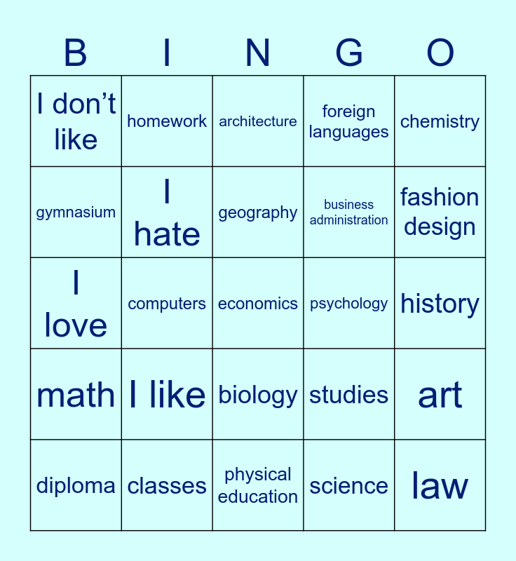 This bingo card has 41 words: to love, I love, to hate, I hate, classes, biology, geography, physics, chemistry, math, computers, foreign languages, economics, history, psychology, I like, I really like, I don’t like, to pass an exam/test, architecture, art, law, physical education, business administration, humanities, philosophy, science, political science, fashion design, scholarship, cafeteria, homework, diploma, school, studies, gymnasium, grade, university cafeteria, useless, useful and especially, above all.