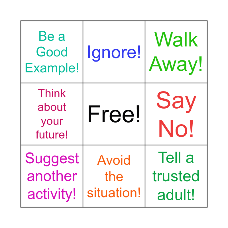 This bingo card has a free space and 8 words: Say No!, Walk Away!, Ignore!, Suggest another activity!, Be a Good Example!, Tell a trusted adult!, Think about your future! and Avoid the situation!.