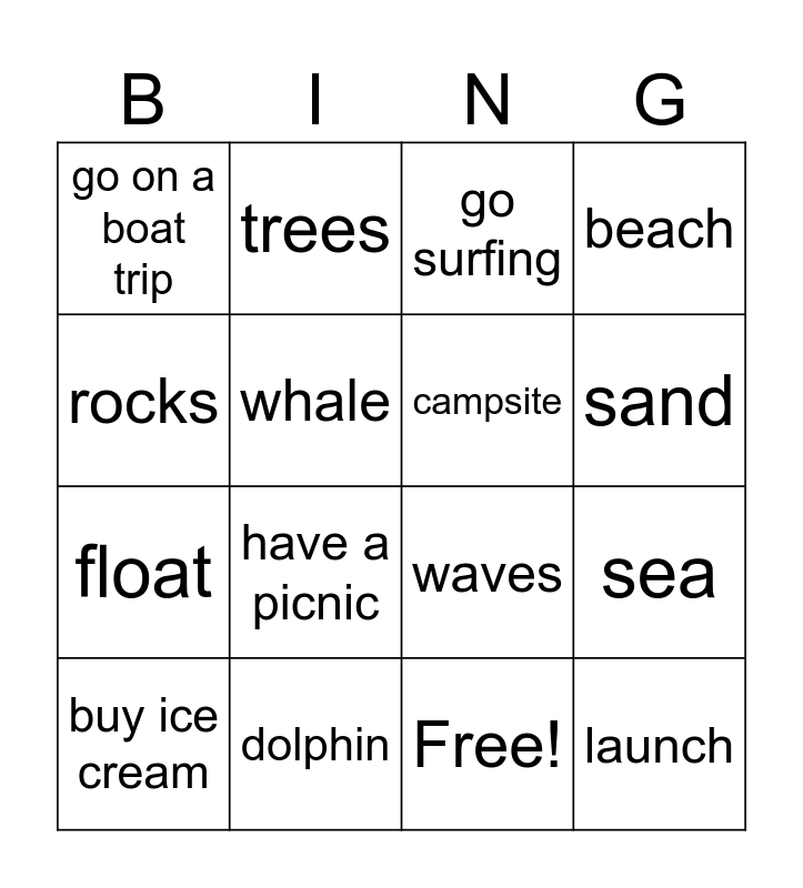 This bingo card has 17 words: Free!, buy ice cream, go surfing, go on a boat trip, have a picnic, beach, sea, campsite, sand, whale, dolphin, waves, rocks, trees, float, breathe and launch.