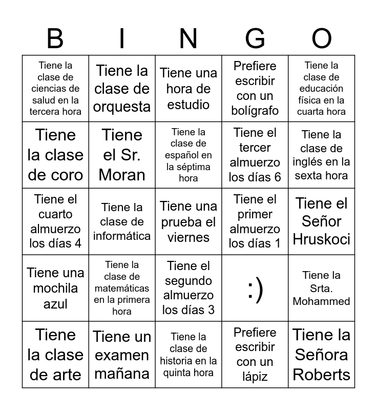 This bingo card has 25 words: Tiene la clase de matemáticas en la primera hora, Tiene la clase de historia en la quinta hora, Tiene la clase de español en la séptima hora, Tiene la clase de arte, Tiene la clase de educación física en la cuarta hora, Tiene la clase de ciencias de salud en la tercera hora, Tiene la clase de coro, Tiene la clase de orquesta, Tiene el primer almuerzo los días 1, Tiene el segundo almuerzo los días 3, Tiene el tercer almuerzo los días 6, Tiene el cuarto almuerzo los días 4, :), Tiene la Srta. Mohammed, Tiene el Sr. Moran, Tiene la Señora Roberts, Tiene el Señor Hruskoci, Tiene una hora de estudio, Tiene la clase de inglés en la sexta hora, Tiene la clase de informática, Tiene una prueba el viernes, Tiene un examen mañana, Tiene una mochila azul, Prefiere escribir con un bolígrafo and Prefiere escribir con un lápiz.
