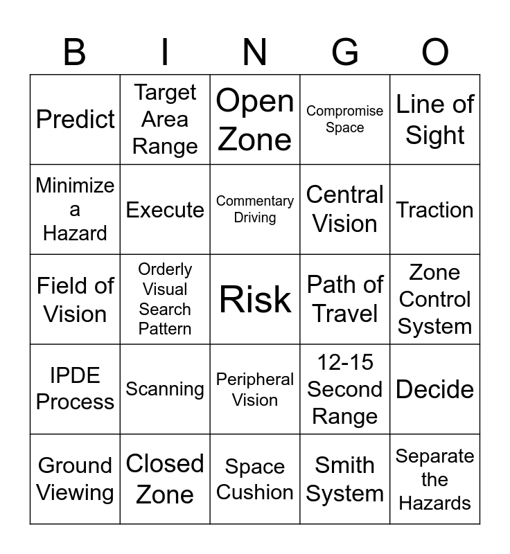 This bingo card has 25 words: IPDE Process, Closed Zone, Risk, Smith System, Line of Sight, Predict, Target Area Range, Open Zone, Path of Travel, Decide, Minimize a Hazard, Execute, Space Cushion, 12-15 Second Range, Traction, Ground Viewing, Orderly Visual Search Pattern, Commentary Driving, Central Vision, Zone Control System, Field of Vision, Scanning, Peripheral Vision, Compromise Space and Separate the Hazards.