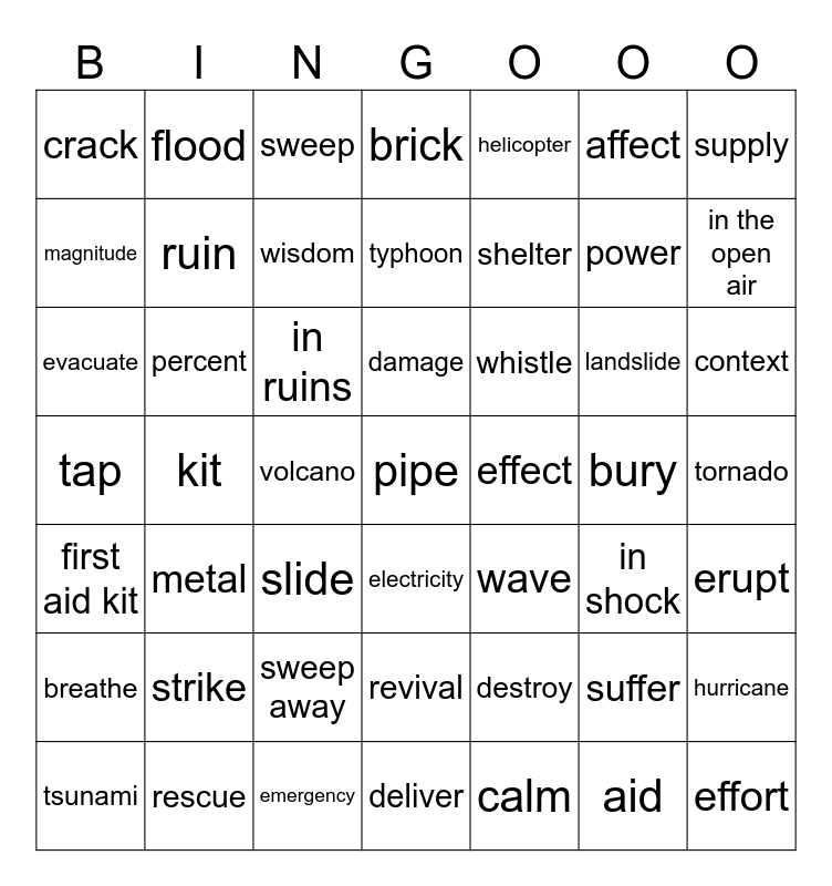 This bingo card has 63 words: disaster, tornado, drought, landslide, slide, tsunami, flood, volcanic eruption, magnitude, rescue, damage, destroy, evacuate, helicopter, death, affect, shelter, crack, as if, ruin, in ruins, percent, brick, metal, shock, in shock, electricity, trap, bury, breathe, revive, revival, effort, unify, wisdom, context, suffer, volcano, erupt, supply, typhoon, in the open air, hurricane, survive, power, tap, pipe, whistle, emergency, calm, aid, kit, first aid kit, on hand, crash, sweep, sweep away, wave, strike, deliver, summary, effect and length.