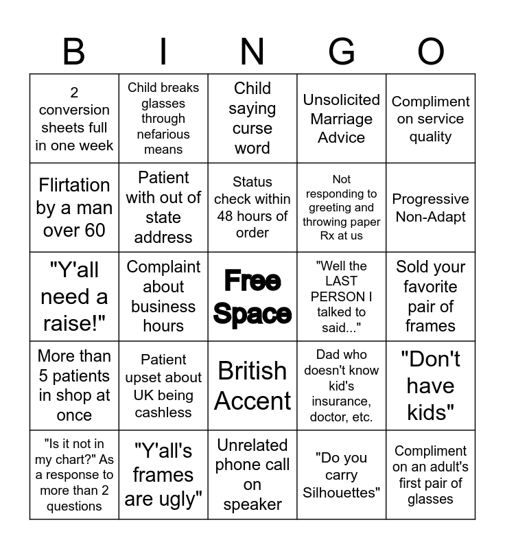 This bingo card has a free space and 24 words: Patient upset about UK being cashless, "Y'all's frames are ugly", Status check within 48 hours of order, "Is it not in my chart?" As a response to more than 2 questions, Compliment on service quality, 2 conversion sheets full in one week, Flirtation by a man over 60, Child breaks glasses through nefarious means, "Well the LAST PERSON I talked to said...", British Accent, Not responding to greeting and throwing paper Rx at us, "Y'all need a raise!", Dad who doesn't know kid's insurance, doctor, etc., "Don't have kids", Patient with out of state address, "Do you carry Silhouettes", Sold your favorite pair of frames, Child saying curse word, Progressive Non-Adapt, Complaint about business hours, Compliment on an adult's first pair of glasses, More than 5 patients in shop at once, Unsolicited Marriage Advice and Unrelated phone call on speaker.