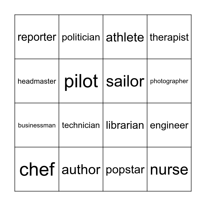 This bingo card has 20 words: engineer, receptionist, athlete, architect, chef, headmaster, author, reporter, businessman, politician, technician, librarian, pilot, nurse, sailor, model, photographer, therapist, popstar and DJ.