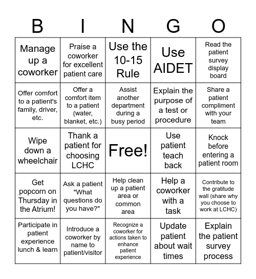 This bingo card has a free space and 29 words: Participate in patient experience lunch & learn, Greet a patient, Thank a patient for choosing LCHC, Escort a patient instead of pointing, Manage up a coworker, Use the 10-15 Rule, Offer a comfort item to a patient (water, blanket, etc.), Ask a patient "What questions do you have?", Use patient teach back, Introduce a coworker by name to patient/visitor, Knock before entering a patient room, Explain the patient survey process, Recognize a coworker for actions taken to enhance patient experience, Update patient about wait times, Share a patient compliment with your team, Nominate a coworker for Stream of Excellence, Help clean up a patient area or common area, Get popcorn on Thursday in the Atrium!, Read the patient survey display board, Wipe down a wheelchair, Help a coworker with a task, Assist a patient (hold door, push wheelchair, etc.), Explain the purpose of a test or procedure, Offer comfort to a patient's family, driver, etc., Use AIDET, Praise a coworker for excellent patient care, Contribute to the gratitude wall (share why you choose to work at LCHC), Assist another department during a busy period and Report a safety concern to the appropriate team.