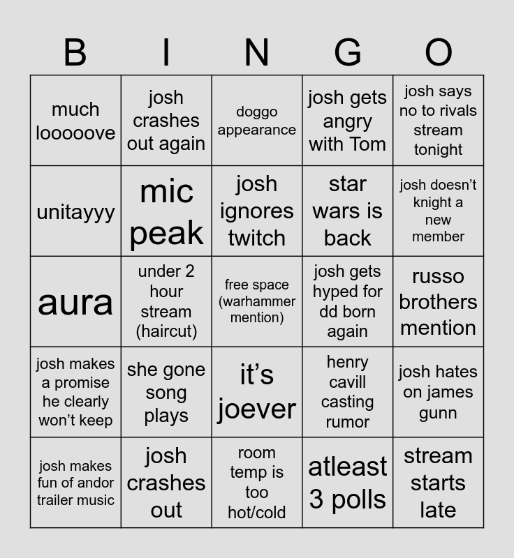 This bingo card has a free space and 24 words: she gone song plays, josh crashes out, josh ignores twitch, josh makes fun of andor trailer music, josh says no to rivals stream tonight, much looooove, unitayyy, josh crashes out again, josh gets hyped for dd born again, it’s joever, star wars is back, aura, henry cavill casting rumor, josh hates on james gunn, mic peak, atleast 3 polls, russo brothers mention, doggo appearance, josh doesn’t knight a new member, under 2 hour stream (haircut), stream starts late, josh makes a promise he clearly won’t keep, josh gets angry with Tom and room temp is too hot/cold.