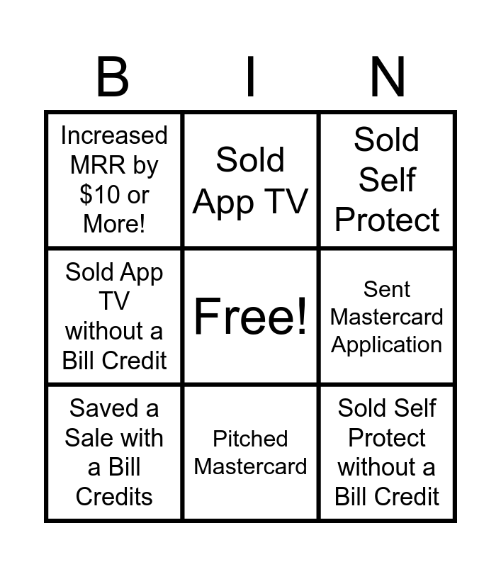 This bingo card has a free space and 8 words: Sent Mastercard Application, Sold Self Protect, Sold App TV, Saved a Sale with a Bill Credits, Increased MRR by $10 or More!, Sold Self Protect without a Bill Credit, Sold App TV without a Bill Credit and Pitched Mastercard.