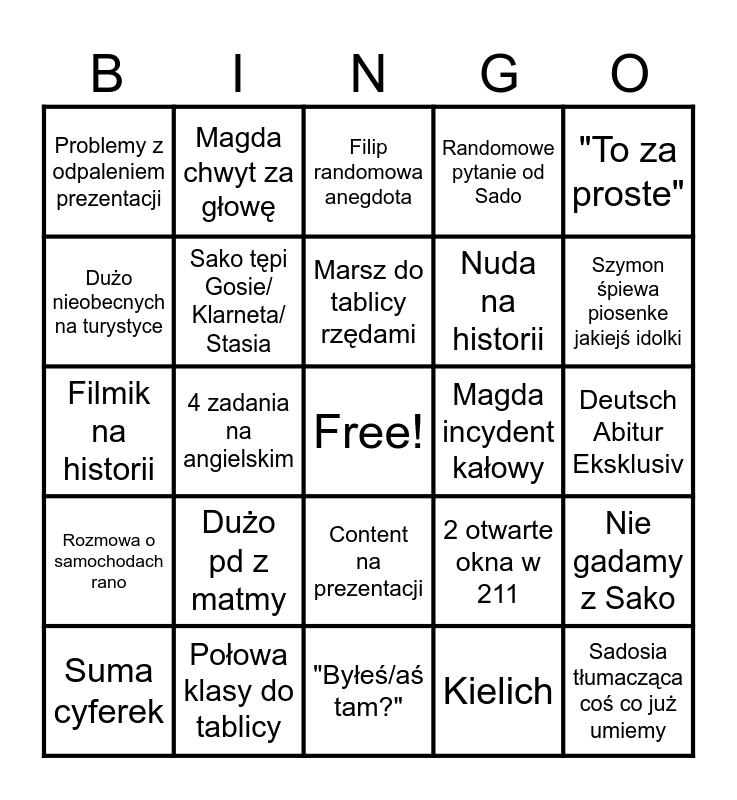 This bingo card has a free space and 24 words: Dużo pd z matmy, Połowa klasy do tablicy, Marsz do tablicy rzędami, Suma cyferek, "To za proste", Problemy z odpaleniem prezentacji, Dużo nieobecnych na turystyce, Magda chwyt za głowę, Magda incydent kałowy, Content na prezentacji, Nuda na historii, Filmik na historii, 2 otwarte okna w 211, Nie gadamy z Sako, Sako tępi Gosie/ Klarneta/ Stasia, Kielich, Deutsch Abitur Eksklusiv, Filip randomowa anegdota, Szymon śpiewa piosenke jakiejś idolki, 4 zadania na angielskim, Sadosia tłumacząca coś co już umiemy, Rozmowa o samochodach rano, Randomowe pytanie od Sado and "Byłeś/aś tam?".