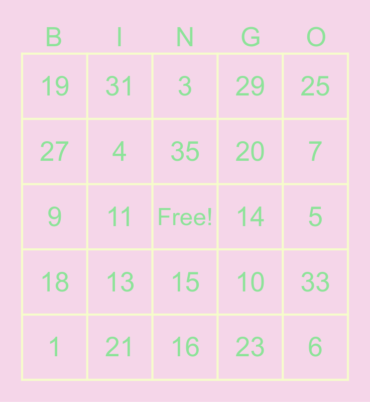 This bingo card has a free space and 29 words: 1, 2, 11, 12, 19, 3, 4, 13, 14, 21, 5, 6, 16, 23, 7, 8, 15, 18, 25, 9, 10, 17, 20, 27, 29, 31, 33, 35 and 37.