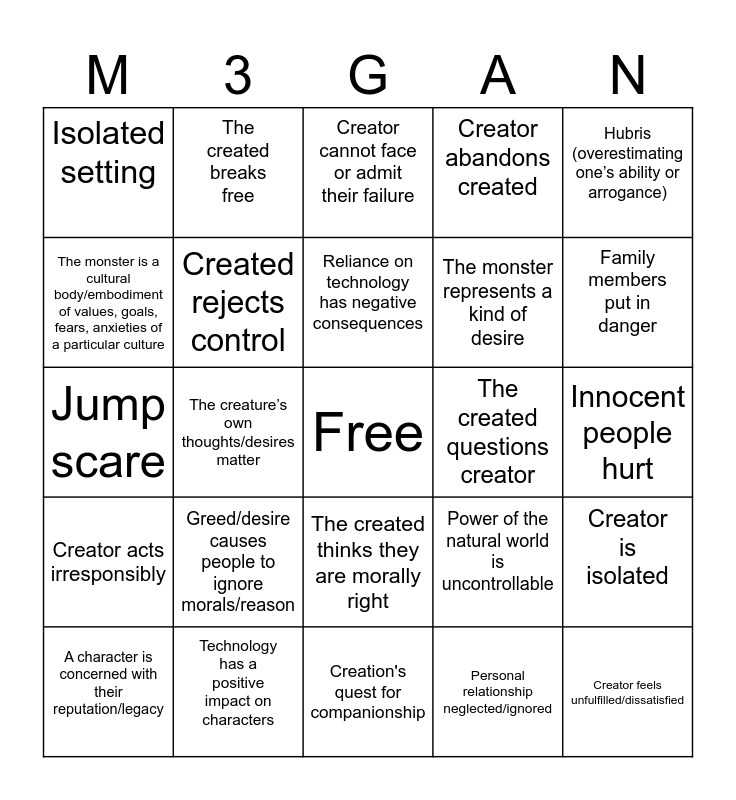This bingo card has a free space and 24 words: Greed/desire causes people to ignore morals/reason, Technology has a positive impact on characters, Reliance on technology has negative consequences, A character is concerned with their reputation/legacy, Hubris (overestimating one’s ability or arrogance), Isolated setting, The monster is a cultural body/embodiment of values, goals, fears, anxieties of a particular culture, The created breaks free, The created questions creator, The created thinks they are morally right, The monster represents a kind of desire, Jump scare, Power of the natural world is uncontrollable, Creator is isolated, Created rejects control, Personal relationship neglected/ignored, Innocent people hurt, Creator cannot face or admit their failure, Family members put in danger, The creature’s own thoughts/desires matter, Creator feels unfulfilled/dissatisfied, Creator acts irresponsibly, Creator abandons created and Creation's quest for companionship.