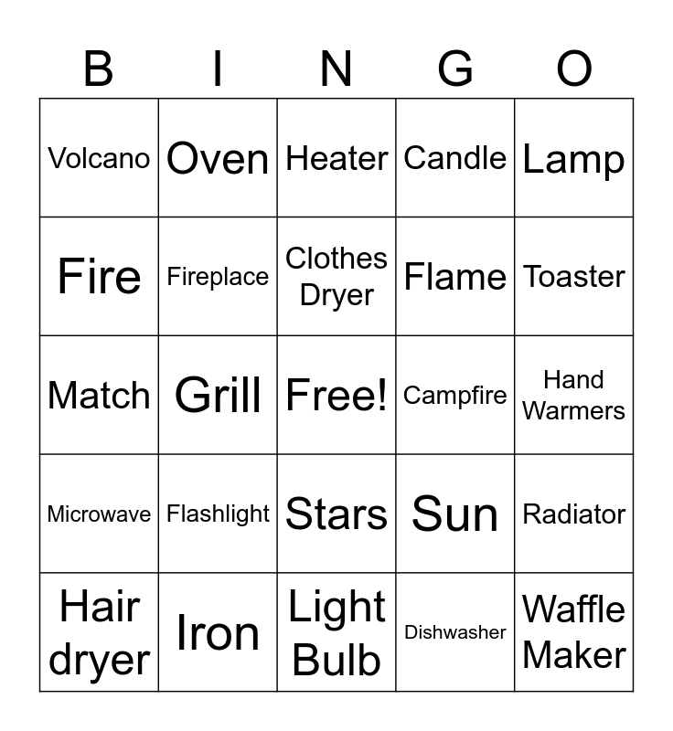 This bingo card has a free space and 27 words: Sun, Stove, Flame, Light Bulb, Fire, Heater, Oven, Microwave, Campfire, Radiator, Match, Candle, Hair dryer, Iron, Toaster, Friction, Fireplace, Clothes Dryer, Flashlight, Volcano, Hand Warmers, Dishwasher, Grill, Waffle Maker, Stars, Lamp and Lightning.