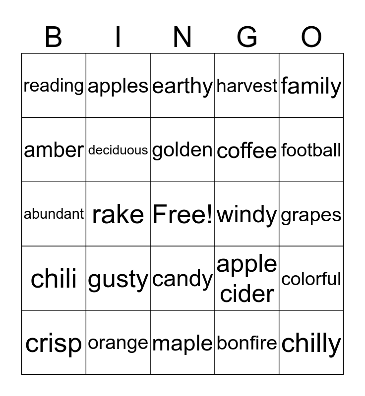 This bingo card has a free space and 24 words: gusty, orange, golden, crisp, family, reading, amber, apples, windy, candy, coffee, abundant, apple cider, colorful, deciduous, bonfire, grapes, earthy, football, rake, chilly, chili, harvest and maple.