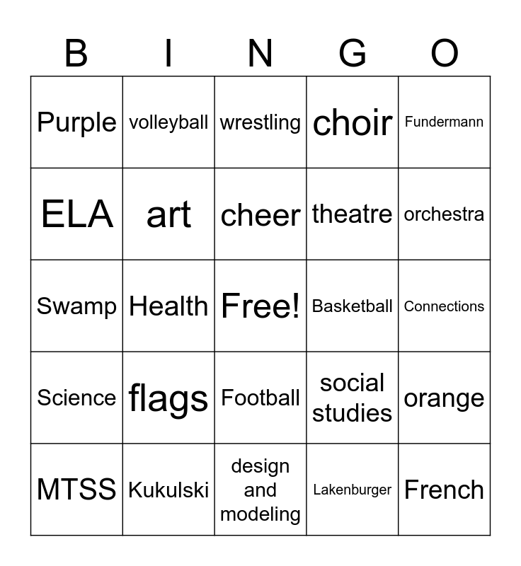 This bingo card has a free space and 39 words: math, PE, AVID, art, MTSS, Football, cheer, May, Fundermann, Science, Health, choir, French, Connections, Basketball, flags, Waterman, Purple, leadership, social studies, ELA, design and modeling, theatre, orchestra, band, Spanish, ACE, sports, medical detectives, volleyball, swim, cross country, wrestling, Kukulski, Lakenburger, gold, orange, Swamp and Diversity council.