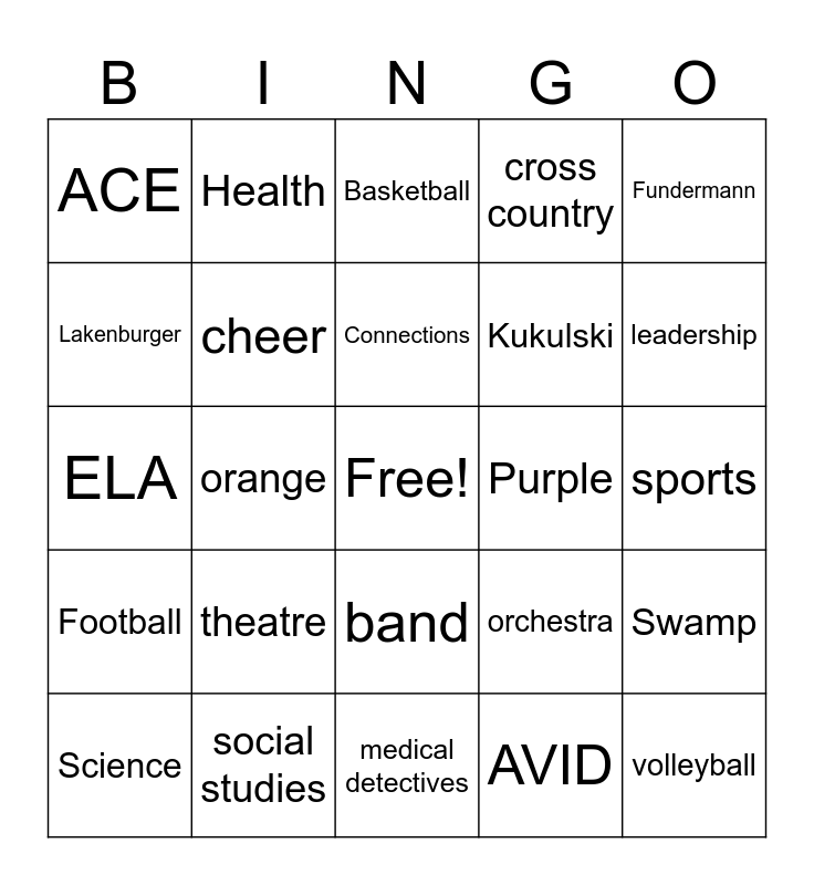 This bingo card has a free space and 34 words: PE, AVID, art, MTSS, Football, cheer, Fundermann, Science, Health, French, Connections, Basketball, flags, Waterman, Purple, leadership, social studies, ELA, theatre, orchestra, band, Spanish, ACE, sports, medical detectives, volleyball, cross country, wrestling, Kukulski, Lakenburger, gold, orange, Swamp and Diversity council.