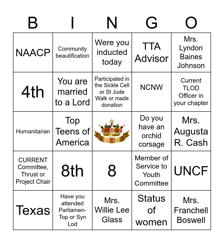 This bingo card has a free space and 24 words: Texas, 8th, Participated in the Sickle Cell or St Jude Walk or made donation, Status of women, Mrs. Lyndon Baines Johnson, NAACP, Community beautification, Were you inducted today, Do you have an orchid corsage, Mrs. Augusta R. Cash, Humanitarian, You are married to a Lord, Member of Service to Youth Committee, UNCF, 4th, Have you attended Parliamen-Top or Syn Lod, Mrs. Willie Lee Glass, TTA Advisor, Current TLOD Officer in your chapter, CURRENT Committee, Thrust or Project Chair, Top Teens of America, 8, NCNW and Mrs. Franchell Boswell.