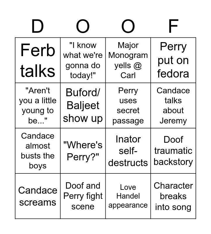 This bingo card has 19 words: Inator self-destructs, Fireside girls earn patch, Major Monogram yells @ Carl, Character breaks into song, Doof traumatic backstory, "Aren't you a little young to be...", Love Handel appearance, Ferb talks, "I know what we're gonna do today!", Candace almost busts the boys, "Where's Perry?", Buford/ Baljeet show up, Perry uses secret passage, Doof and Perry fight scene, Candace screams, "What'cha doin?", Perry put on fedora, Candace talks about Jeremy and Vanessa appearance.