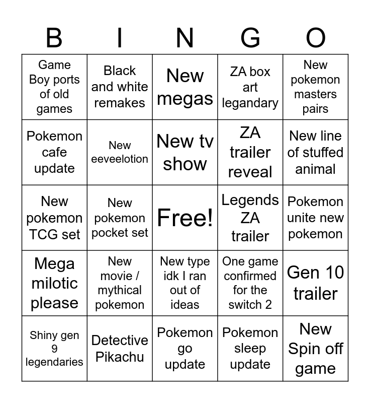 This bingo card has a free space and 24 words: New movie / mythical pokemon, Detective Pikachu, New tv show, Shiny gen 9 legendaries, New pokemon masters pairs, Game Boy ports of old games, Pokemon cafe update, Black and white remakes, Legends ZA trailer, New type idk I ran out of ideas, ZA trailer reveal, New pokemon TCG set, One game confirmed for the switch 2, Gen 10 trailer, New eeveelotion, Pokemon sleep update, Pokemon unite new pokemon, New megas, New line of stuffed animal, New pokemon pocket set, New Spin off game, Mega milotic please, ZA box art legandary and Pokemon go update.